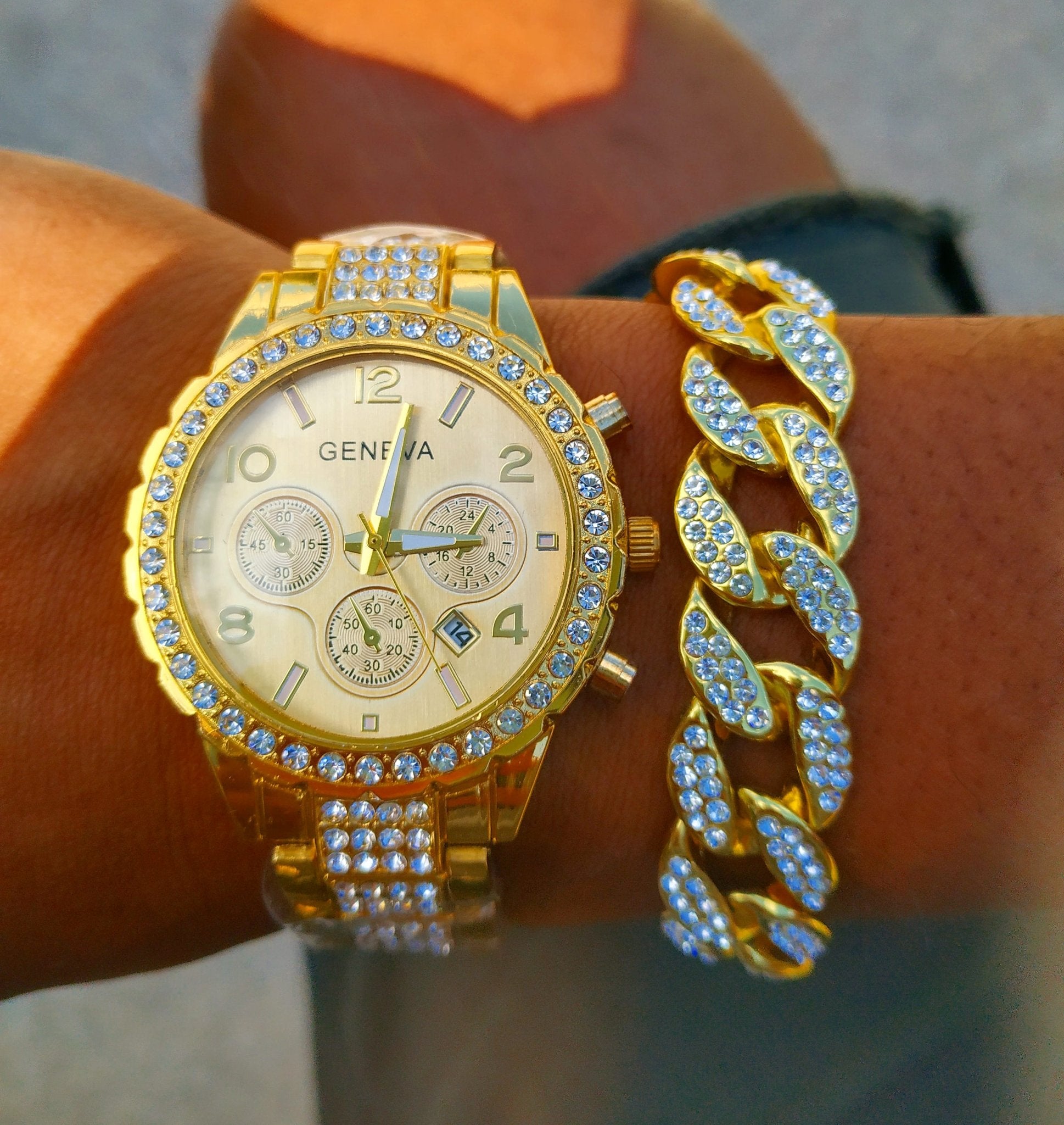 The Cuban Link Watch Set is a stunning set with our best selling Gold N Diamonds Cuban Links Chain paired up with an equally attractive CZ Diamond Cuban Link Bracelet and CZ Diamond Watch.