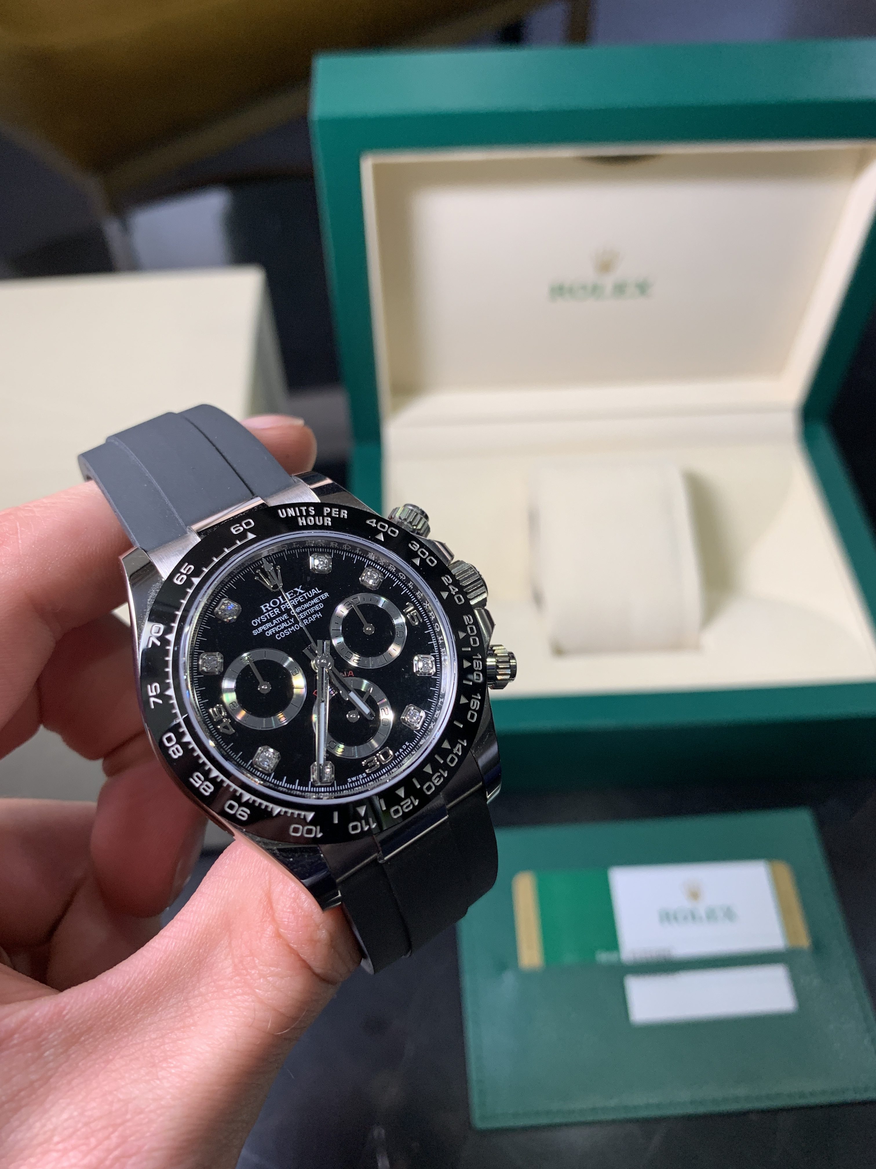 The case is crafted entirely from 18KT white gold with a high-polish finish. It has a black Oysterflex band with a solid 18KT white gold folding oysterlock buckle. This men's Rolex is the epitome of success and high-class. A gloss black dial with diamond hour markers and black/gold subdials offers a handsome contrast against the lustrous white gold finish. Despite its luxurious design, the Daytona is a racer’s watch through and through. The case is built tough, offering resistance to the extreme temperatures and shocks experienced while taking part in endurance races. The case also offers a Rolex calibre 4130 self-winding automatic COSC superlative chronometer certified perpetual movement, complete with anti-shock technology and stopwatch functions.