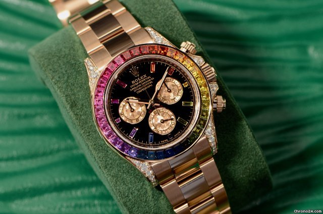 The Rolex Daytona Rainbow (116595RBOW) comes in three versions- the original 2012 Yellow gold and White Gold vintages and the new brand new Everose. A thoroughbred Rolex Daytona