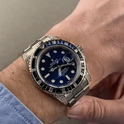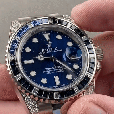 This is an 18K white gold Rolex Submariner 116659SABR. t includes an integral Rolex 18K white gold Oysterlock bracelet with a folding deployment clasp and a scratch resistant sapphire crystal. It has a screwed down solid case back and Triplock winding crown protected by diamond set crown guards. The solid three-body 40 mm. diameter case, straight diamond set lugs, bracelet and flat knurled bezel, are polished and brushed. The graduated unidirectional revolving bezel is white gold and set with 27 b aguette cut sapphires, and 11 baguette cut diamonds every 10 minutes, the dive triangle at the 60-minute position is set with a triangular diamond. It has a sunburst blue dial with luminous white gold-set dot, baton, and arrow hour index markers, luminous white gold "Mercedes" style Rolex minute and hour hands, a center sweep second hand with a luminous "lollipop" indicator, a white minute/second perimeter chapter ring, and a cyclops magnification lens for the date aperture window at 3 o'clock. It's water resistant to 330 meter/1,000 feet, it has a 48-hour power reserve at full winding, and the 13mm thick case, dial, and movement are all signed.
