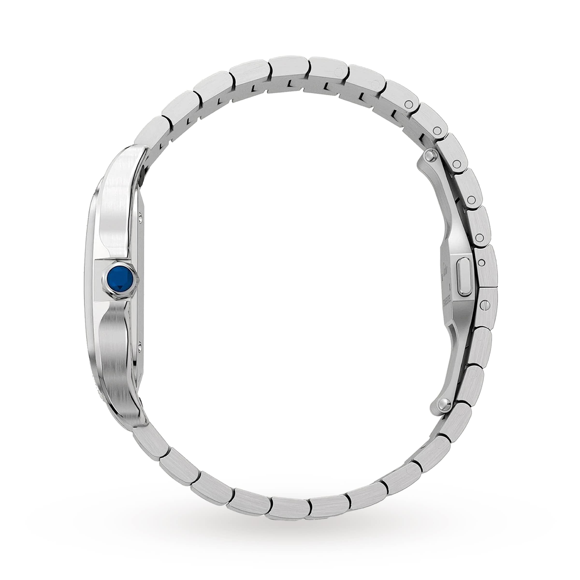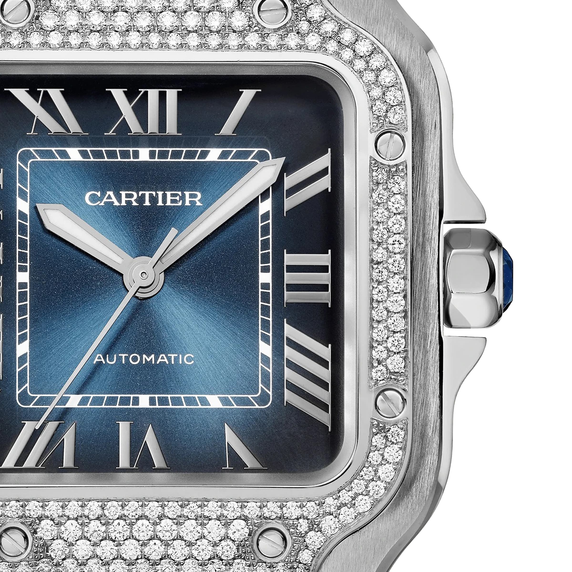 Santos watch, medium model, mechanical movement with automatic winding, calibre 1847 MC. Steel case, steel bezel set with 206 brilliant-cut diamonds totalling 0.64 carat. 7-sided crown set with a faceted synthetic spinel, graduated blue dial, steel sword-shaped hands, sapphire crystal. Steel bracelet with SmartLink adjustment system. Second strap in alligator skin, with interchangeable steel folding buckle. Both are fitted with the QuickSwitch interchangeable system. Case width: 35.1 mm, thickness: 8.83 mm. Water-resistant to 10 bar (approx. 100 metres).