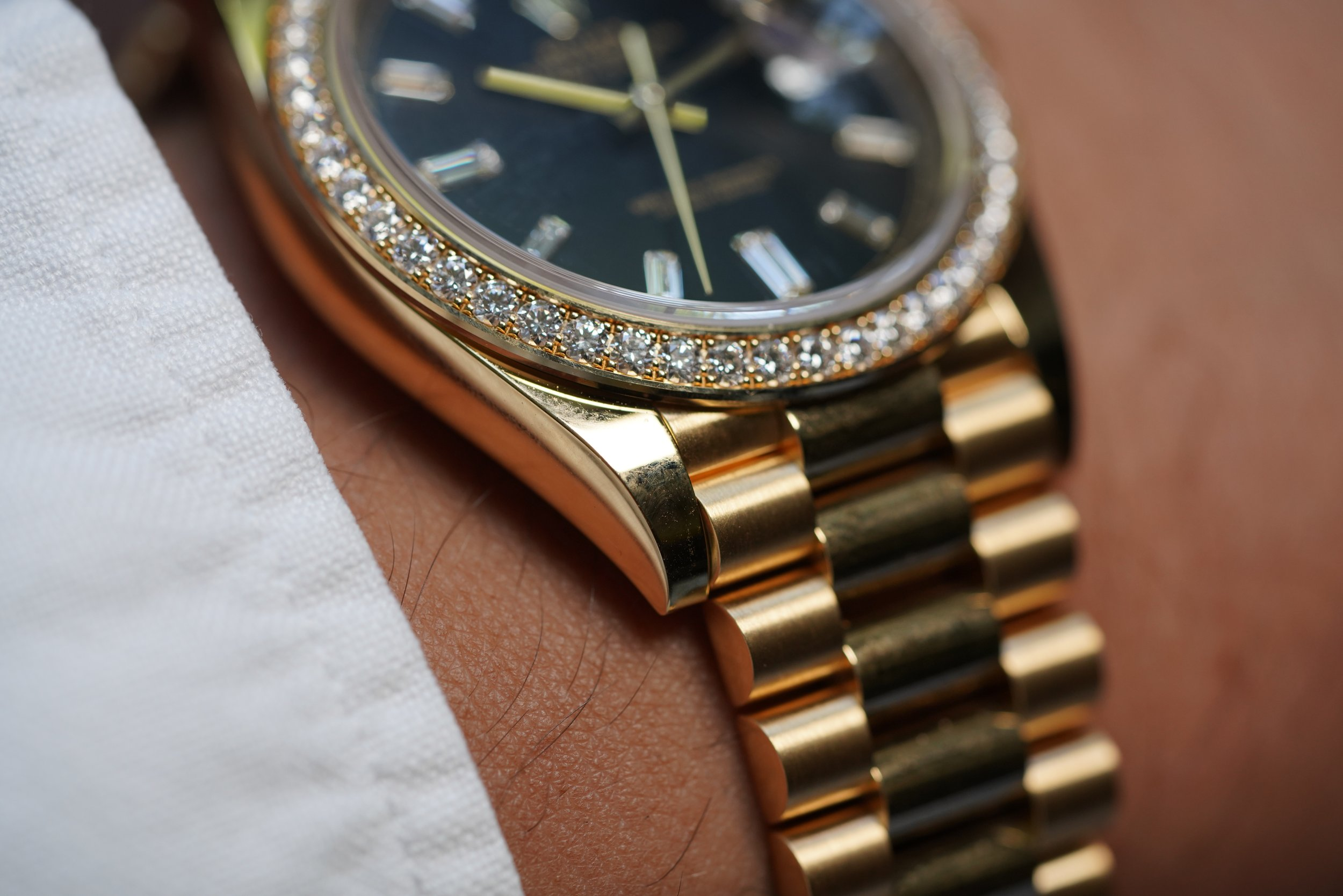 When you wear a Rolex, everyone respects you. When you wear a Day-Date, everyone remembers you. When you wear the Rolex Day-Date 40 reference 228348RBR with diamond bezel and baguette set indices, everyone worships you.