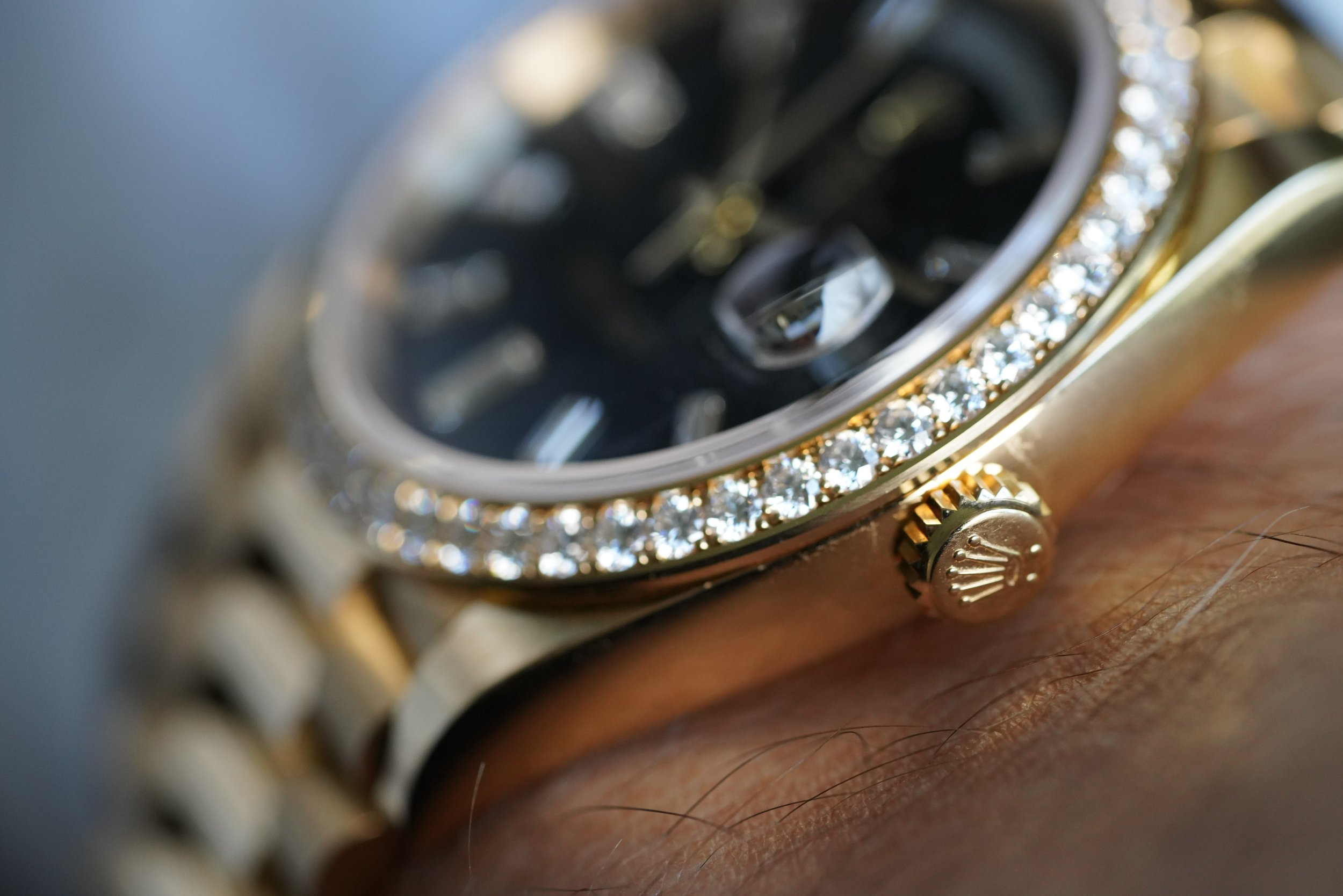 Diamond-set Rolex models are incredibly beautiful and the nicest stones/settings in any watch manufacturer. This 228348RBR is a very attractive and elegant model which is amazing on the wrist. The black dial and contrasting 18K yellow gold case make for a very luxurious look. The case measures 40mm in diameter.