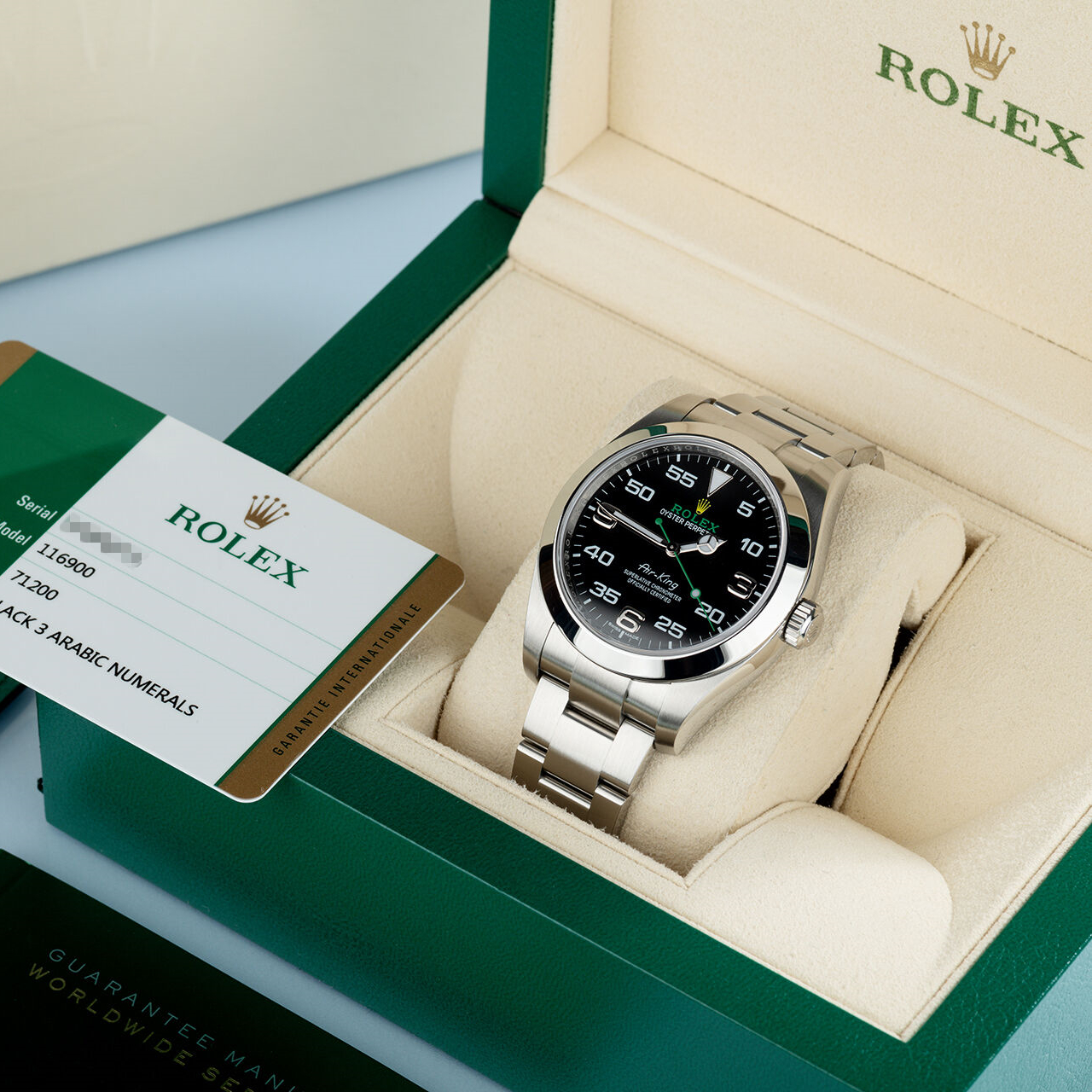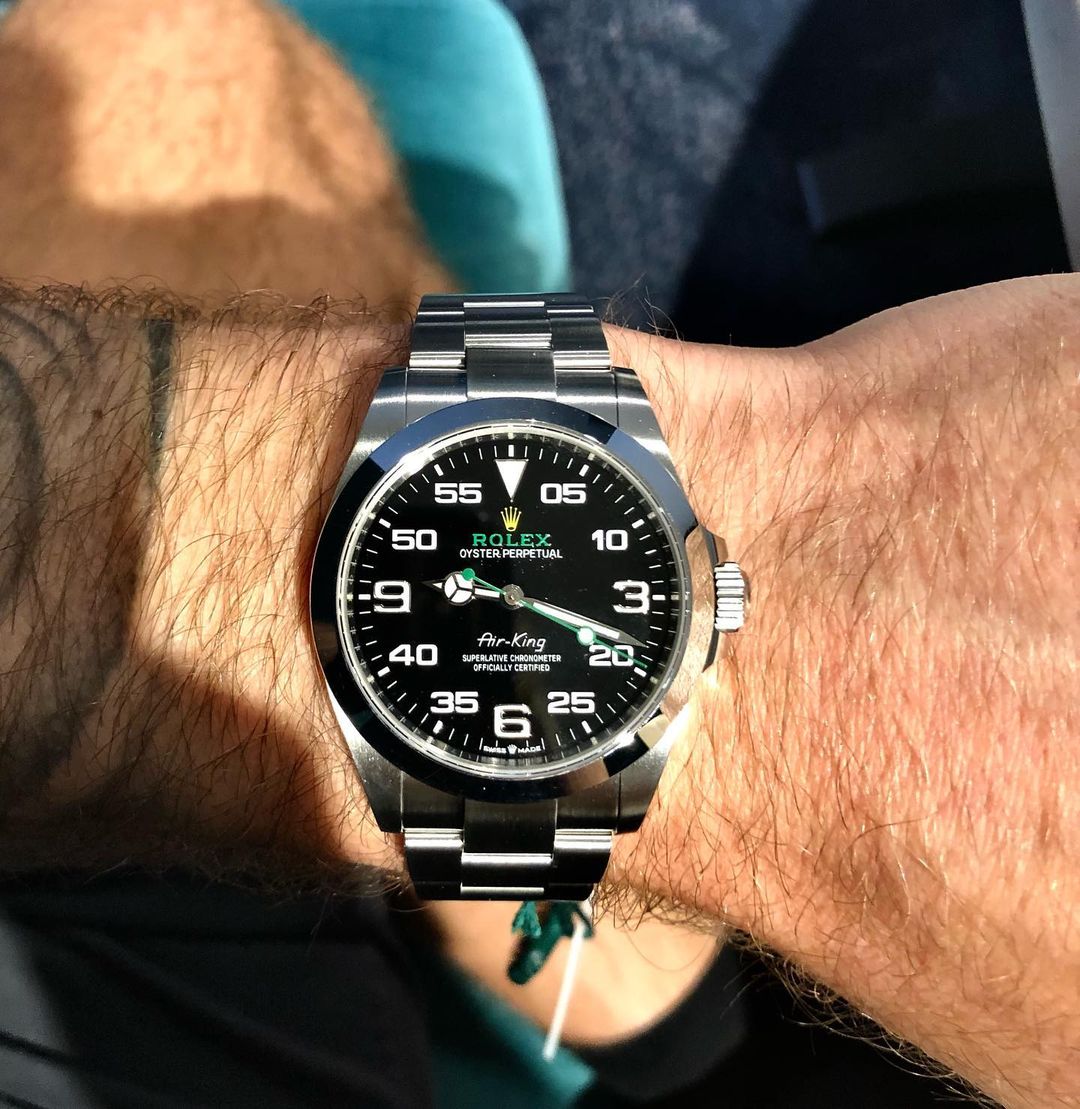 Rolex released a new edition of the sporty Air-King in 2022 under reference 126900. Much to the delight of even the most die-hard Rolex enthusiasts, the new Air-King now has its own case with newly-added crown guards and uses the next-generation caliber 3230 time-only dial. It also keeps the same Bloodhound-inspired dial that defined the modern Air-King in 2016 alongside its predecessor ref. 116900 with similar Arabic hour markers, centrally-mounted Mercedes hands, and a vibrant green and gold Rolex logo. The silvered Arabic hour markers seen on reference 116900 were replaced with sportier Chromalight Arabic markers, and a zero was added to the 5-hour marker. Lastly, the bracelet received Rolex's iconic Oysterlock safety clasp. Although seemingly small, these changes are typical of Rolex as the company continues its quest to perfect every aspect of the Rolex Air-King. There is no need to join a long waitlist.