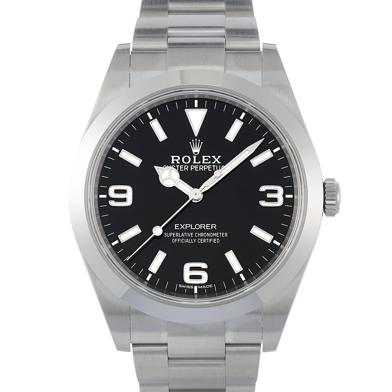 Stainless steel case with an Oyster bracelet. Fixed domed stainless steel bezel. Black dial with luminous hands and stick hour markers. Arabic numerals mark the 3, 6, and 9 o'clock positions. minute markers around the outer rim. Dial Type: Analog. Luminescent hands and markers. Self-winding automatic movement. Scratch-resistant sapphire crystal. Solid case back. Case diameter: 39 mm. Round case shape. Deployment clasp. Water resistant at 100 meters / 330 feet. Functions: hours, minutes, seconds. Luxury watch style. Watch label: Swiss Made.