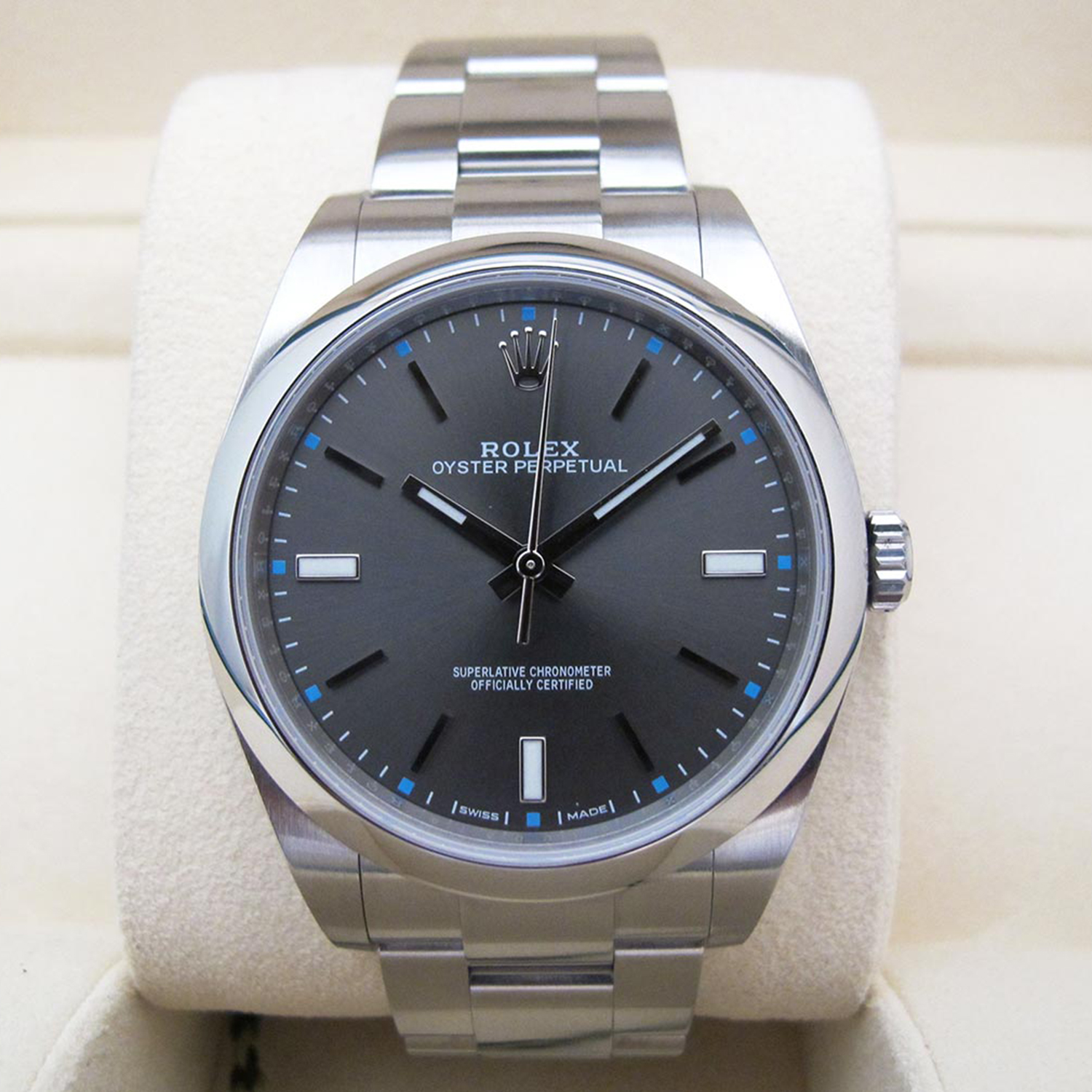 Rolex Perpetual Oyster Perpetual 39 Watch of Stainless Steel. Dark rhodium dial with index hour markers. Screw-down solid crown with twin lock double waterproofness system. Scratch-resistant sapphire crystal. The watch has a central hour, minute and second hands. Stop-seconds for precise time setting. The Stainless Steel Domed bezel. The Watch comes with Mechanical Self-winding Movement & 3132 Caliber w/ 31 jewels & 48hours power reserve. The Stainless Steel Oyster bracelet with flat three-piece links, folding Oysterclasp buckle. The Watch is with Rolex Watch box, Rolex Warranty Card. Covered with Rolex Warranty.