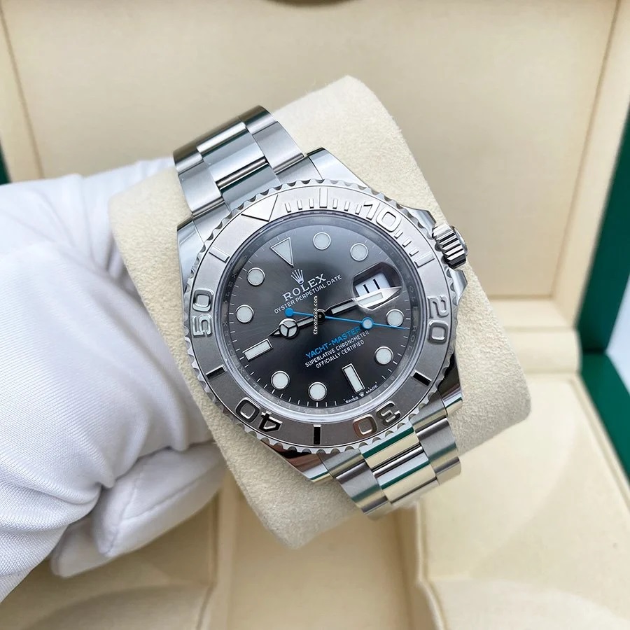 Rolex Perpetual Yacht-Master 40 Watch of Stainless Steel and platinum. Rhodium dial with highly legible Chromalight display with long-lasting blue luminescence. Screw-down, Twinlock double waterproofness system. Scratch-resistant sapphire crystal, Cyclops lens over the date. Centre hour, minute, and seconds hands. Instantaneous date with a rapid setting. Stop-seconds for precise time setting. The 950 platinum bidirectional rotatable 60-minute graduated bezel with raised numerals. The Watch comes with Mechanical Self-winding Movement & 3235 Caliber w/ 31 jewels & 70 hours power reserve. The Oyster of Stainless Steel bracelet with folding Oysterclasp with Easylink 5 mm comfort extension link. The water resistance is up to 100m/330ft. Functions: date, hour, minute, second. Luxury watch style. Watch label: Swiss Made. The Watch is with Rolex Watch box, Rolex Warranty Card. Covered with Rolex Warranty.