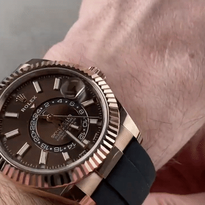 THE OYSTER PERPETUAL SKY-DWELLER IN 18 CT EVEROSE GOLD WITH A CHOCOLATE DIAL AND AN OYSTERFLEX BRACELET.