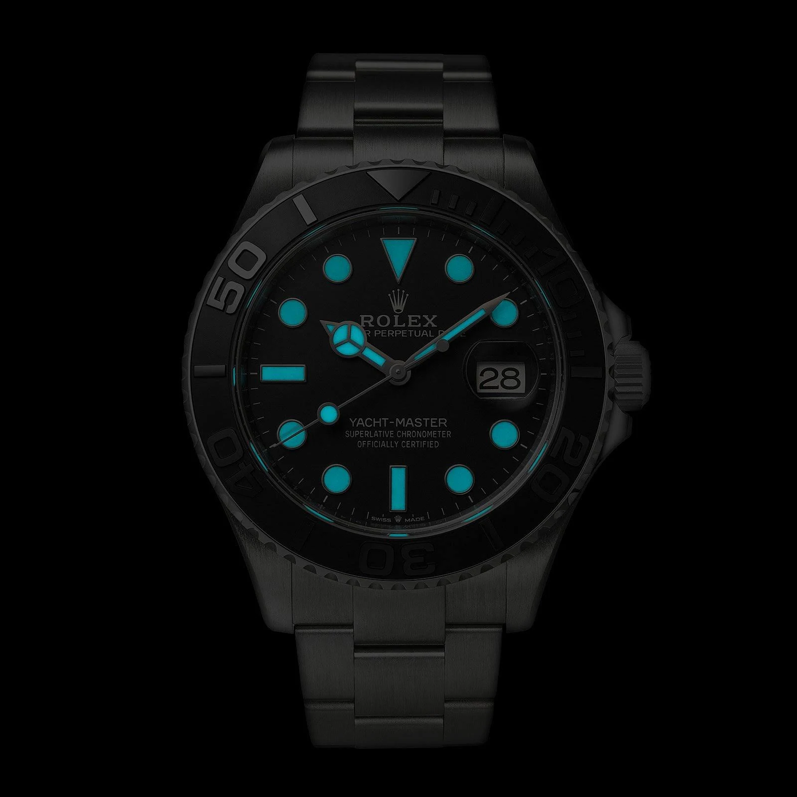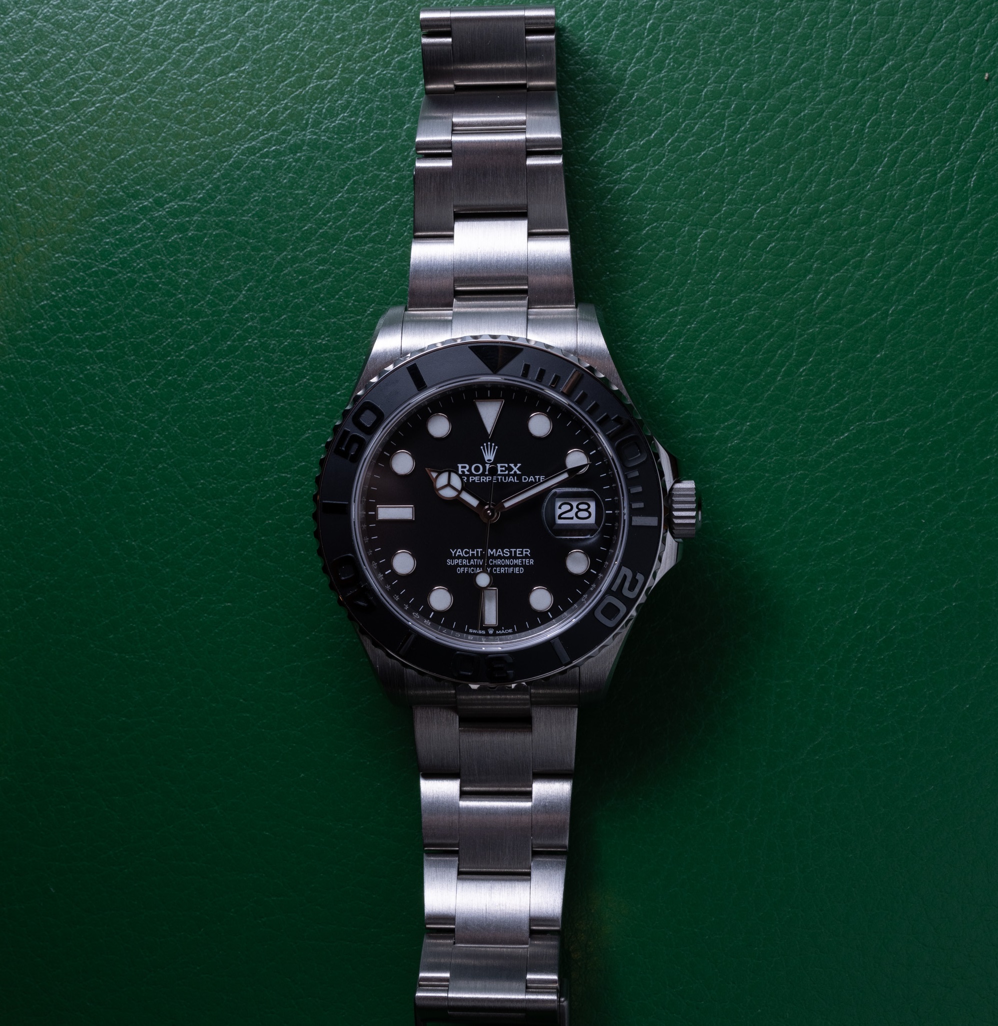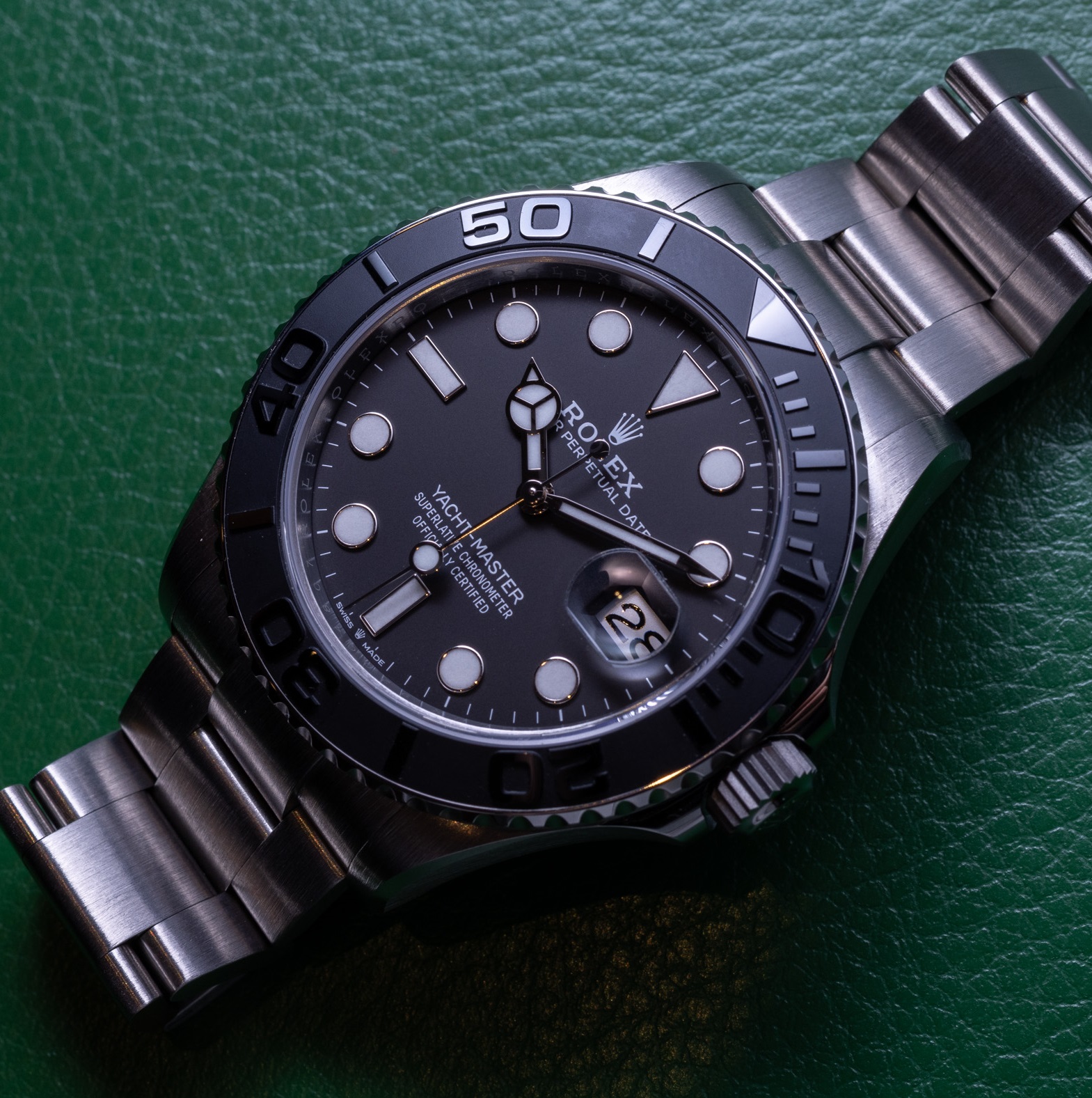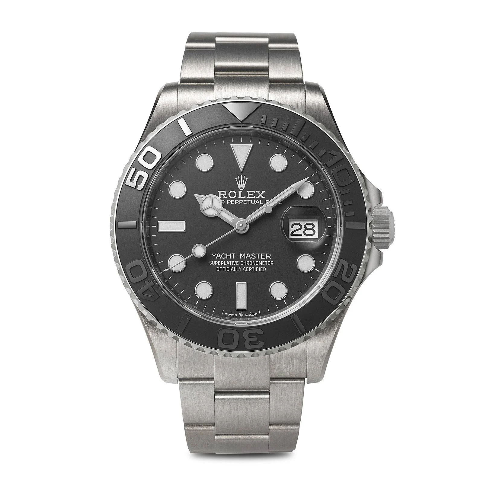The 42mm monobloc middle case of the Yacht-Master 42 is intricately designed with a screw-down case back and winding crown, ensuring its water resistance of up to 100 meters. The bidirectional rotatable 60-minute graduated bezel with a matte black Cerachrom insert in ceramic is another highlight of this timepiece. The polished raised numerals and graduations on the bezel add a touch of sophistication and functionality to the watch, allowing for easy tracking of elapsed time during diving or other outdoor activities.