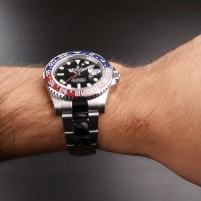 Bezel: Bidirectional rotating bezel with a special 24-hour blue and red "Pepsi" bezel insert.