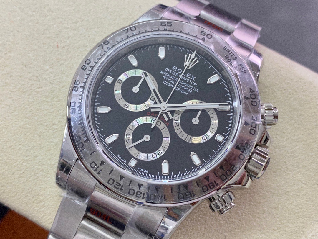 Daytona Swiss replica watches looks and function identical to a genuine Rolex. Our Swiss cloned Rolex chronograph movements feature every Rolex engraving, serial numbering and are lubed with Nano-oil Swiss lubricants and are designed to last a lifetime. Visually and functionally our chronograph movement 28.000 vibrations per hour offers the same fine sweep seconds hand “Rolex” motion as on the genuine Rolex. Our chronograph sub dials displays the seconds, minutes, hours and both screws down buttons are fully functional for the chronograph start-pause-stop functions.