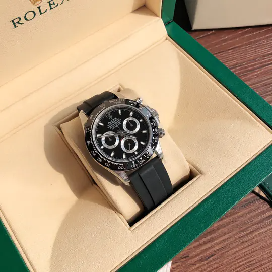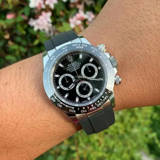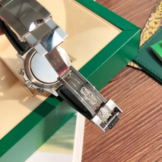 The Daytona’s chronograph feature functions are activated by pushers that screw down like the winding crown when they are not in use, guaranteeing waterproofness to 100 metres. One press to start, stop or reset the chronograph produces a crisp, clear click that was perfected using the most advanced technology. watchmakers also perfected the mechanism to suit the ideal finger pressure on the pushers, and engineered it to provide an instantaneous and accurate start to the timing without sacrificing reliability.