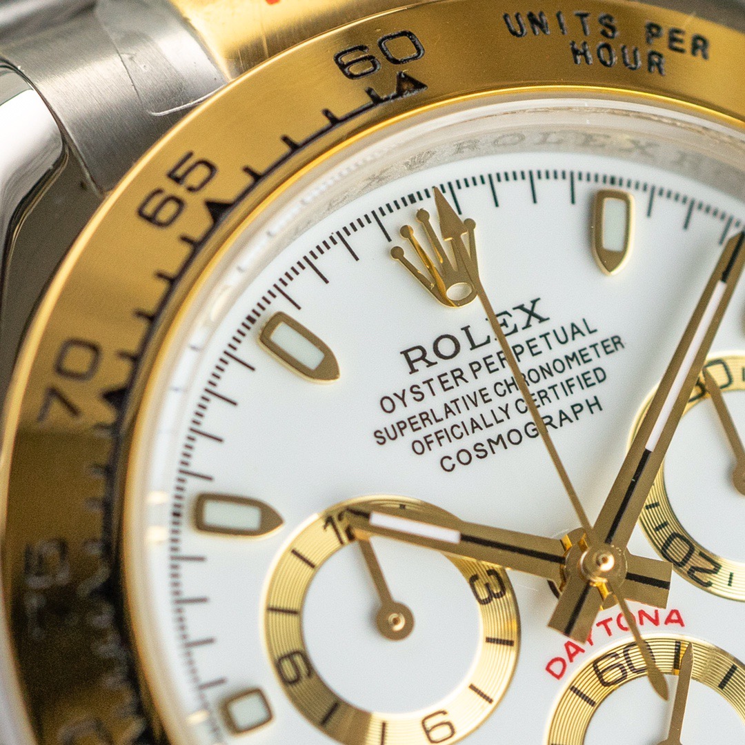 With its tachymetric scale, its three counters and its pushers, the Cosmograph Daytona was designed to be the ultimate timing tool for endurance racing drivers. The bezel features a tachymetric scale to read average speed over a given distance based on elapsed time.