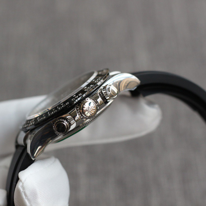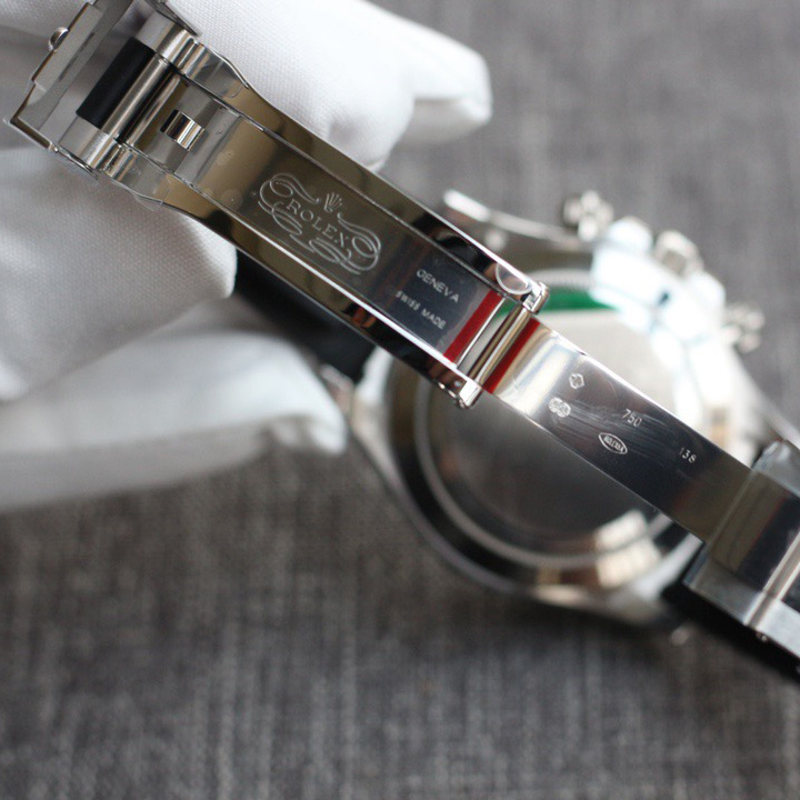 The Daytona’s chronograph feature functions are activated by pushers that screw down like the winding crown when they are not in use, guaranteeing waterproofness to 100 metres. One press to start, stop or reset the chronograph produces a crisp, clear click that was perfected using the most advanced technology. watchmakers also perfected the mechanism to suit the ideal finger pressure on the pushers, and engineered it to provide an instantaneous and accurate start to the timing without sacrificing reliability.