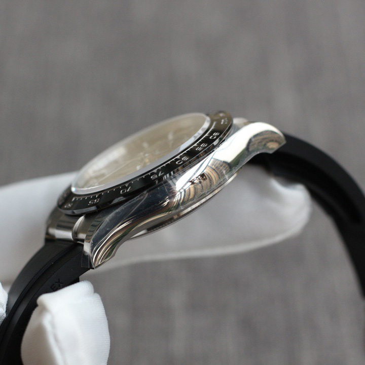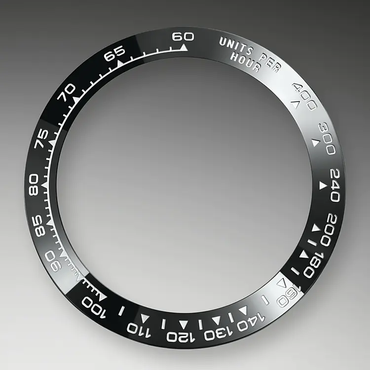 A key part of the model’s identity is the bezel molded with a tachymetric scale for measuring average speeds of up to 400 miles or kilometers per hour. Blending of high technology with sleek aesthetics, the black bezel is reminiscent of the 1965 model that was fitted with a black Plexiglas bezel insert.