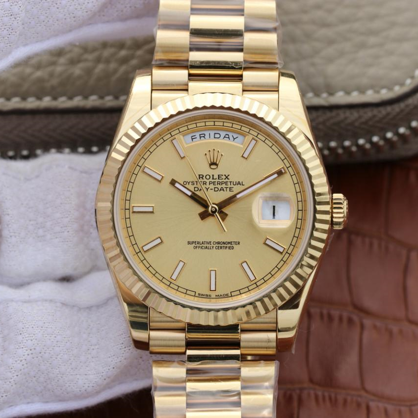 Day-Date Swiss Replica watches looks feel and have the exact same dimensions as the original Rolex using incredible precision down to a nanometer! So the weight is exactly the same with the original Rolex and all watch parts inside/out are interchangeable with a genuine part. Day-Date II=41mm, Day-Date 40=40mm, Day-Date =36mm
