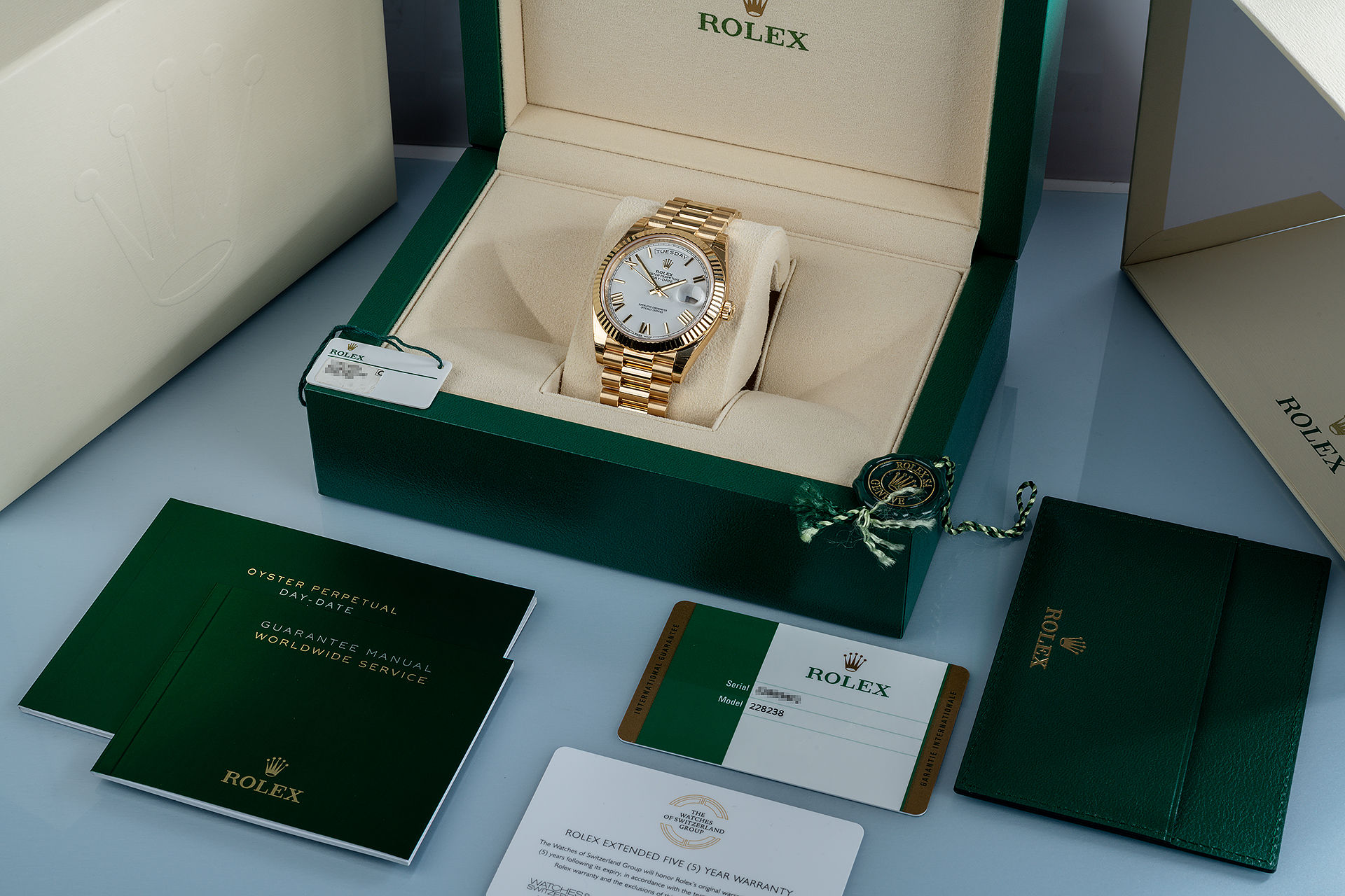 The classic 40mm white Roman dial on this new yellow gold 40mm Day-Date has become one of the most sought after combinations with growing waiting lists at the official Rolex boutique.