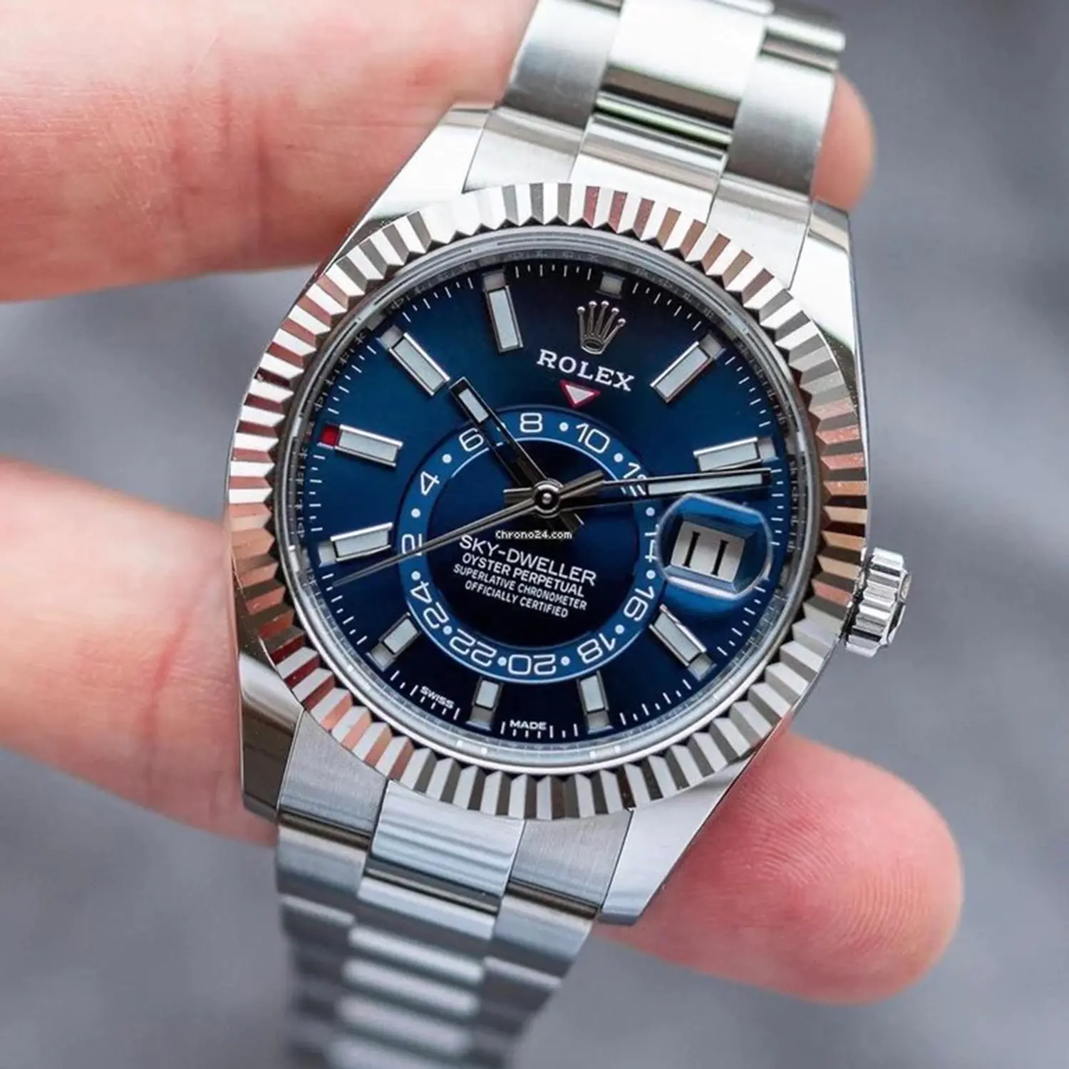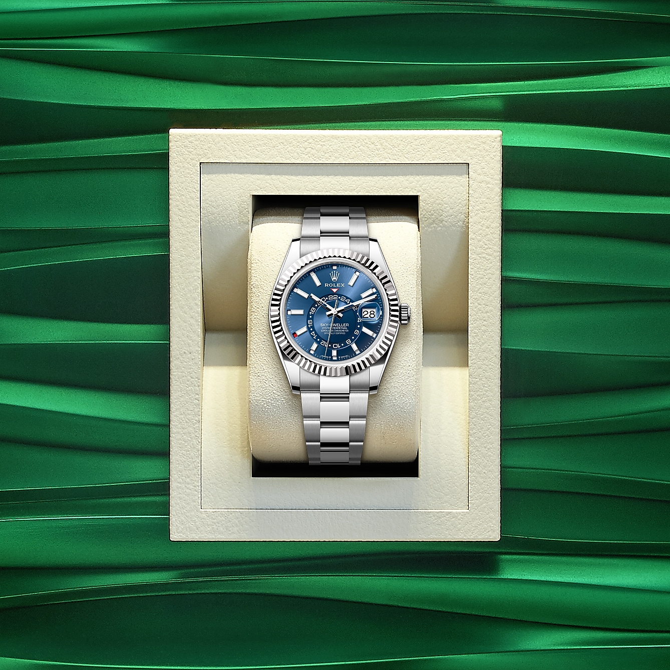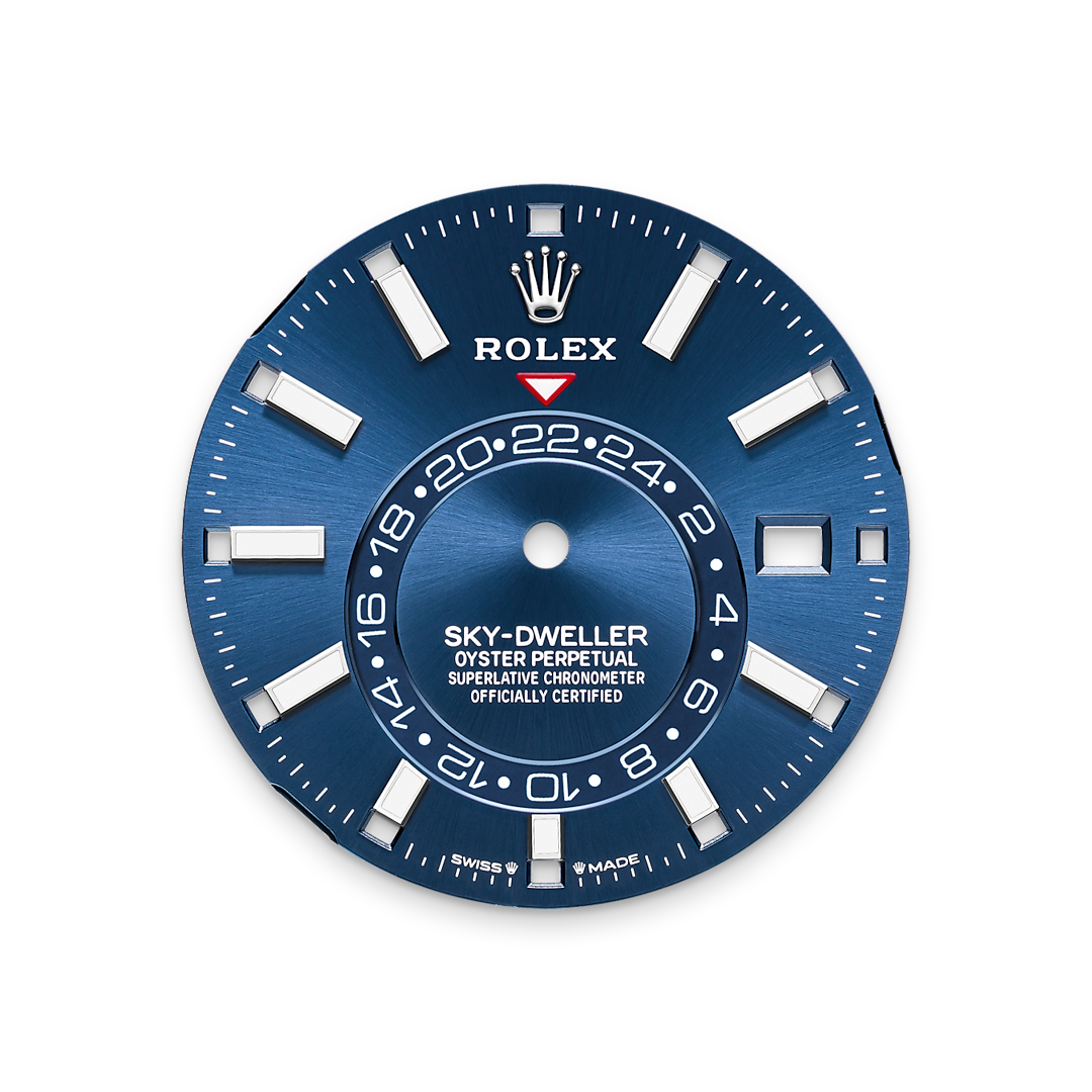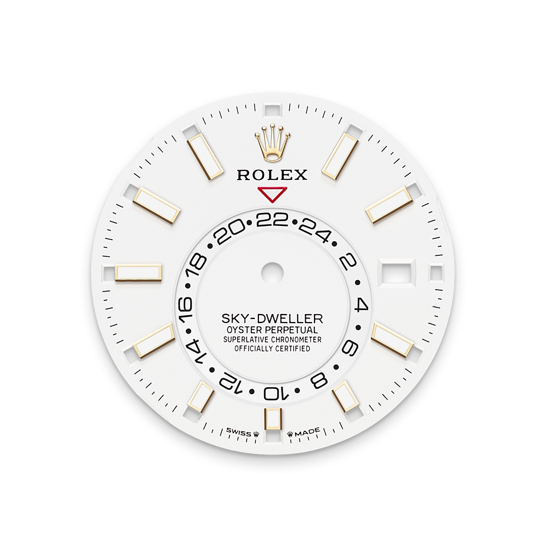 The Sky-Dweller is fitted on a solid-link Oyster bracelet in Oystersteel, in the case of the white Rolesor version, or, for the yellow Rolesor version, an Oyster bracelet combining Oystersteel and yellow gold.