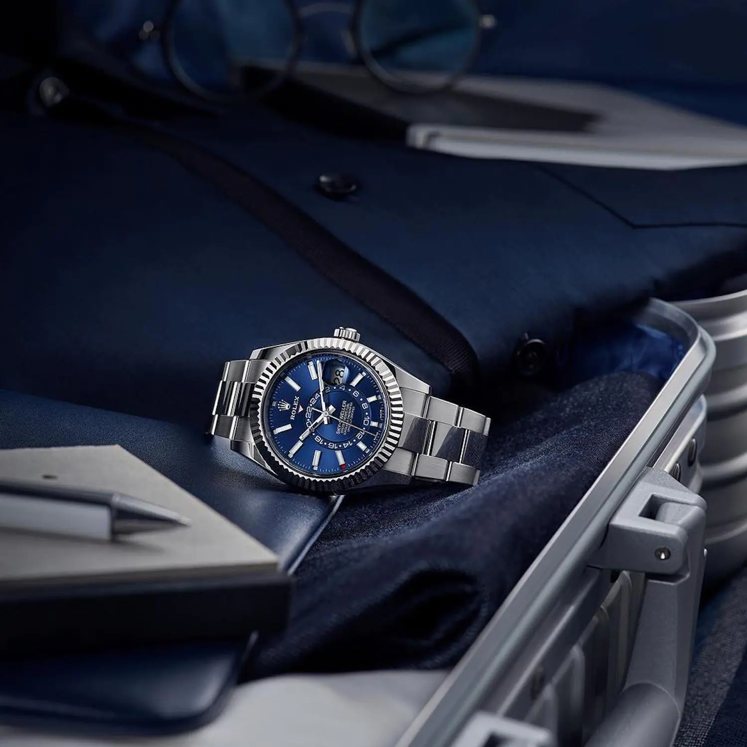 The Oyster Perpetual Sky‑Dweller in Oystersteel and white gold with a bright blue dial and an Oyster bracelet.