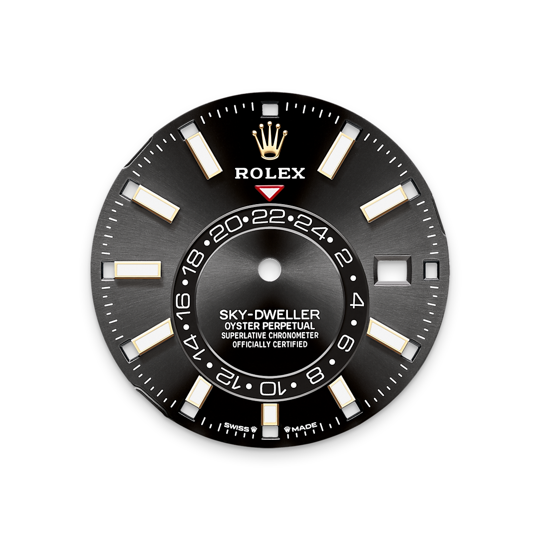 It was therefore identical to the fluting on the case back, which was also screwed onto the case for waterproofness, using specific Rolex tools. Over time, the fluting became an aesthetic element, a genuine Rolex signature feature. Today the fluted bezel is a mark of distinction, always in gold. The Sky-Dweller is equipped with a mechanism of interaction between the rotatable bezel, the winding crown and the movement: the Ring Command system, which allows the user to select the watch's functions one-by-one and to set them easily, quickly and securely.