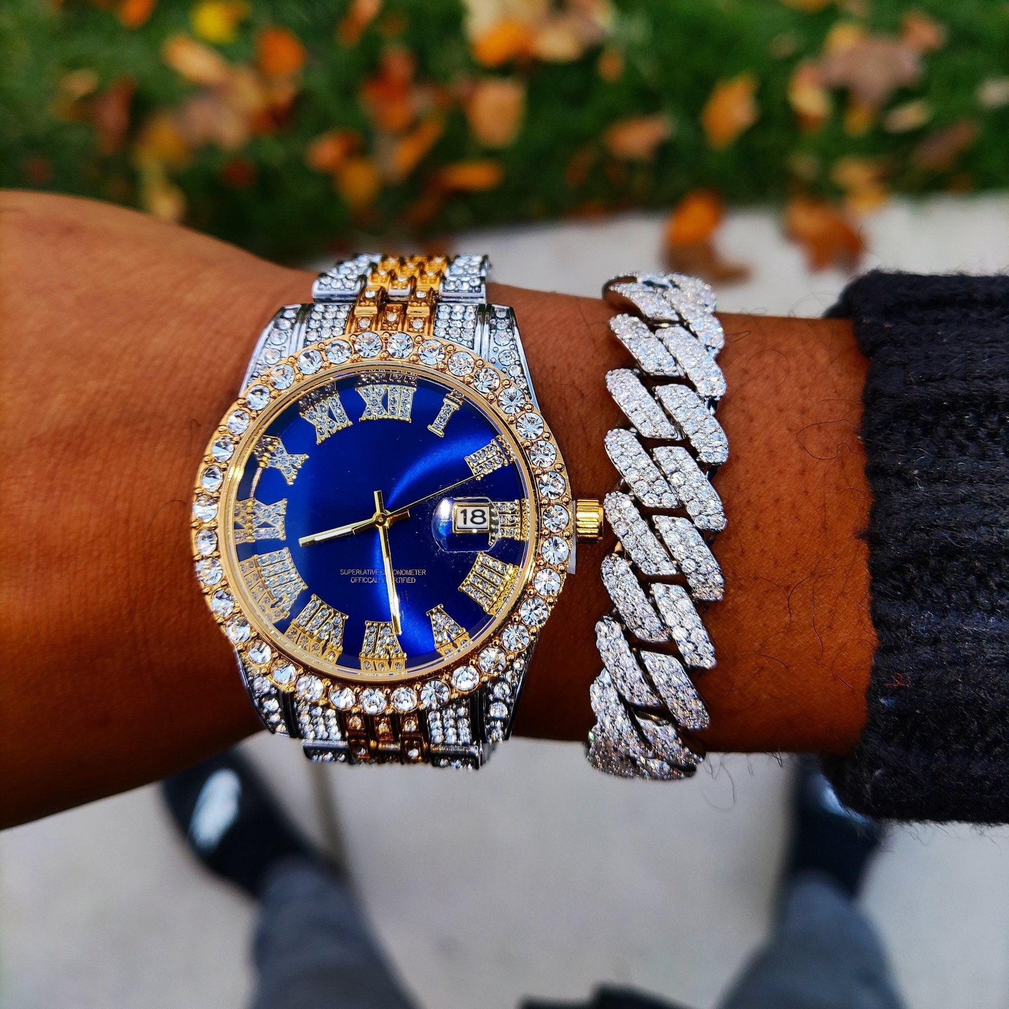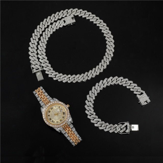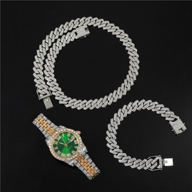 The perfect addition to any jewelry collection! A new style of Cuban Link plus a stunning watch the best way to get the most bang for your buck.