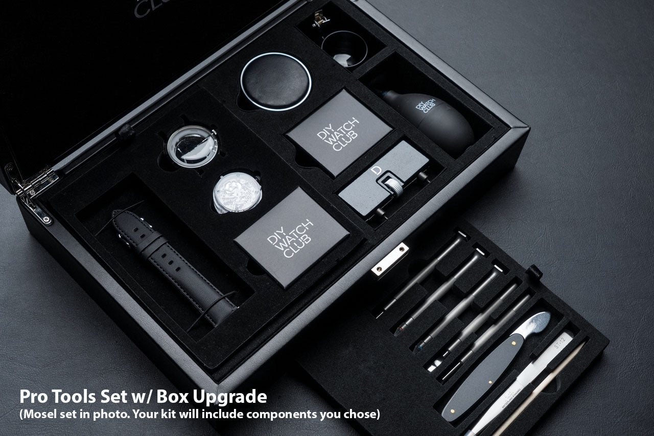 This is our Pro Tool Kit, a DWC in-house design from top to bottom. This is a lot more than a mere step up from standard Amazon watch-making tools; it is a collection of tools we designed and crafted to give you the best watchmaking experience possible.